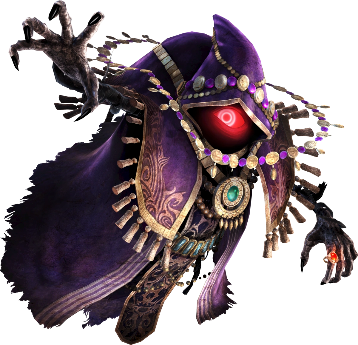 Wizzro is a companion of the sorceress Cia, with whom he rages war onto the Kingdom of Hyrule. Wizzro was originally a cursed ring that, over many centuries, had lured its victims into wearing it, allowing it to absorb their essence and condensing their deceased souls into a single, malevolent spirit. He was reborn as a sorcerer by Cia's dark magic.